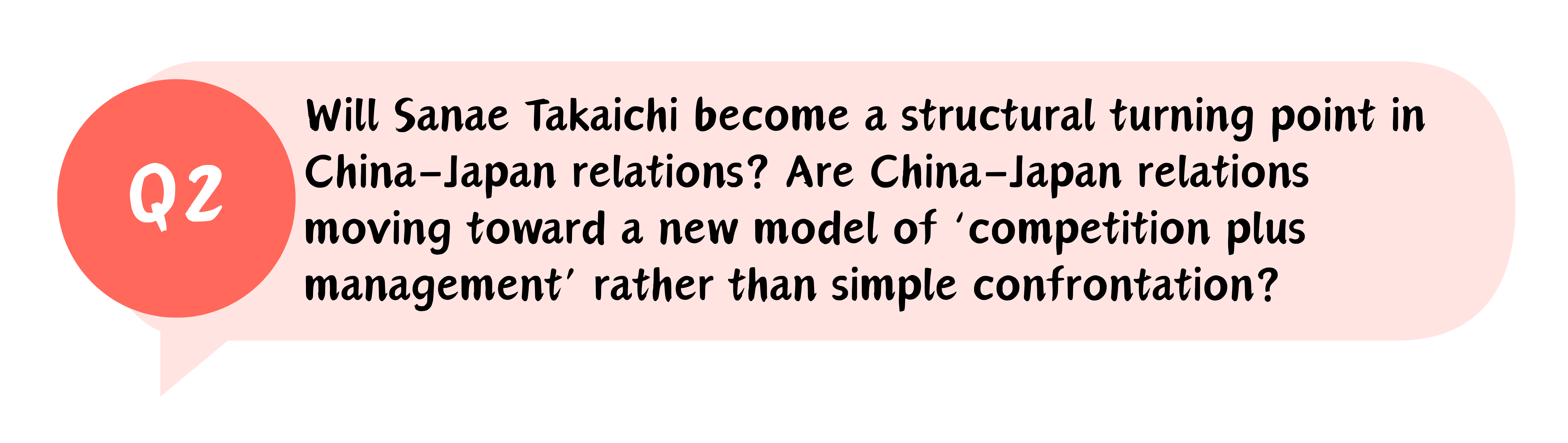 Taken together, these dynamics indicate that China–Japan relations are not simply devolving into confrontation. Instead, they are entering a more complex phase characterized by intensified competition, especially in the security domain, coupled with a growing need for crisis management and guardrail construction. Takaichi may indeed represent a structural inflection point: not because she fundamentally altered Japan’s strategic logic, but because she accelerated the exposure of long-latent contradictions and forced both sides to reconsider the mechanisms needed to prevent uncontrolled escalation. The trajectory ahead is unlikely to return to the cooperative rhetoric of earlier decades; however, mutual dependence, regional stability concerns, and U.S. strategic uncertainties will push both governments to explore a “competition plus management” model as a pragmatic necessity. Managing this competitive equilibrium, rather than eliminating competition itself, will define the next chapter of China–Japan relations.